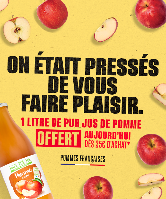 On vous offre une bouteille de pur jus de pomme dès 25€ d'achat*