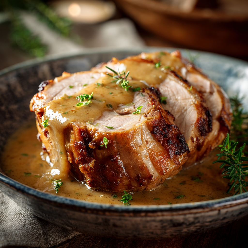 Puis un gourmand rôti de porc sauce moutarde et jus de pomme 🥩